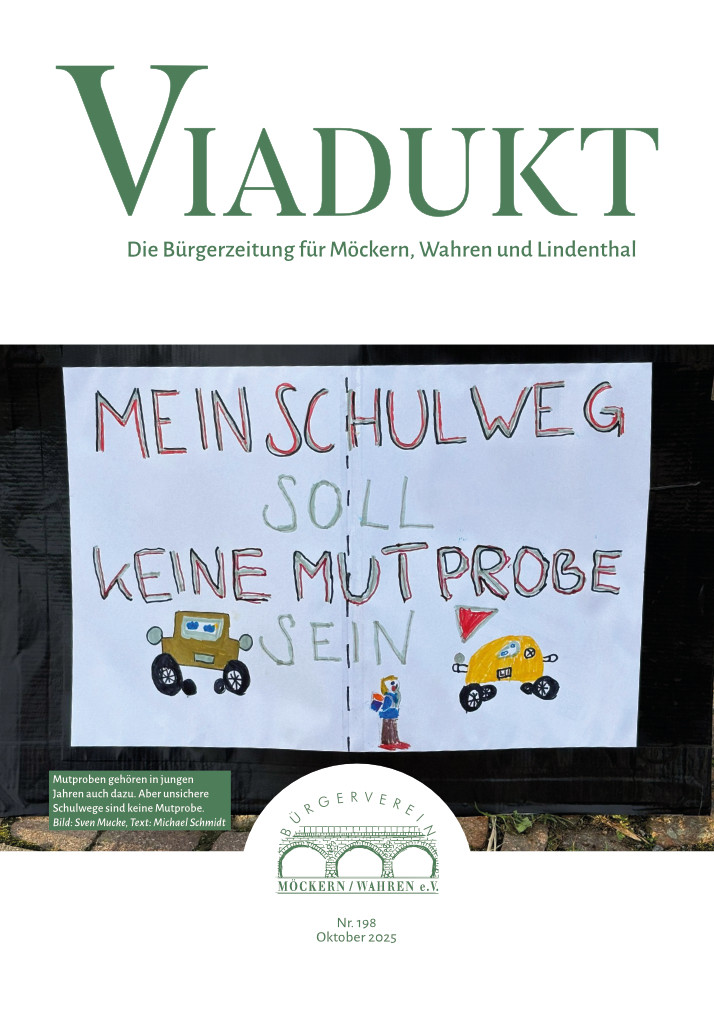 Der Bürgerverein Möckern-Wahren wurde am 11. Mai 1992 aus Anlass des damals geplanten Baus der neuen B6 gegründet. Seitdem ist unser Verein im Leipziger Nordwesten aktiv und kümmert sich um die Belange der Stadtteile sowie die der Menschen, die hier leben. Die Arbeit wird ausschließlich ehrenamtlich ausgeübt. Zu den Tätigkeitsbereichen zählen u. a. die Herausgabe unserer Stadtteilzeitung VIADUKT, die alle acht Wochen erscheint, die Begleitung von geplanten Baumaßnahmen bzw. die Veränderung der Infrastruktur in den Stadtteilen des Nordwestens, die soziale Beratung und die Projekte „Roll-Ups zur Stadtteilgeschichte für Kitas und Grundschulen“.